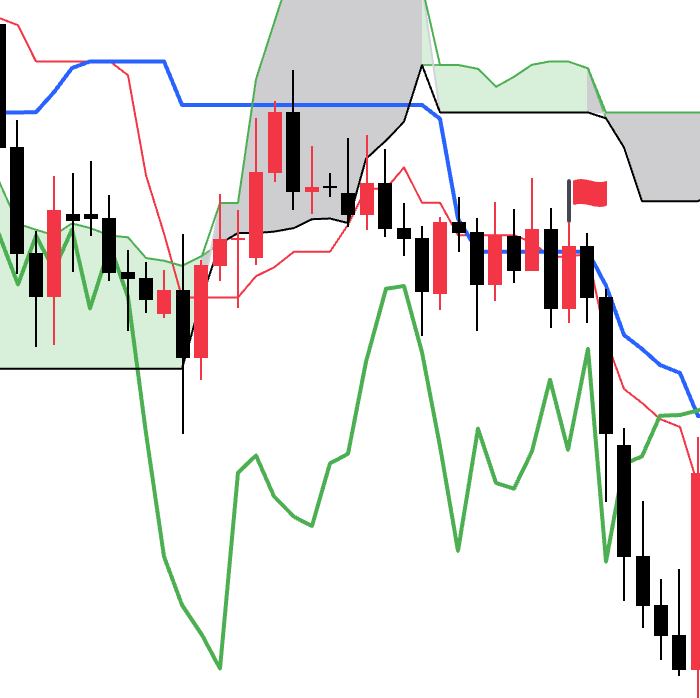 - 当价格线位于云层上方,并且延迟线下穿价格线的时候为初步看跌信号