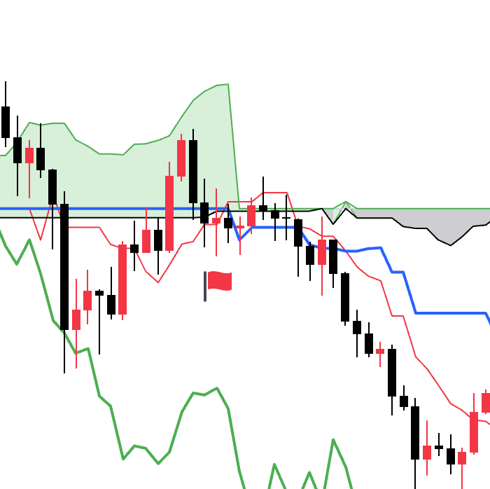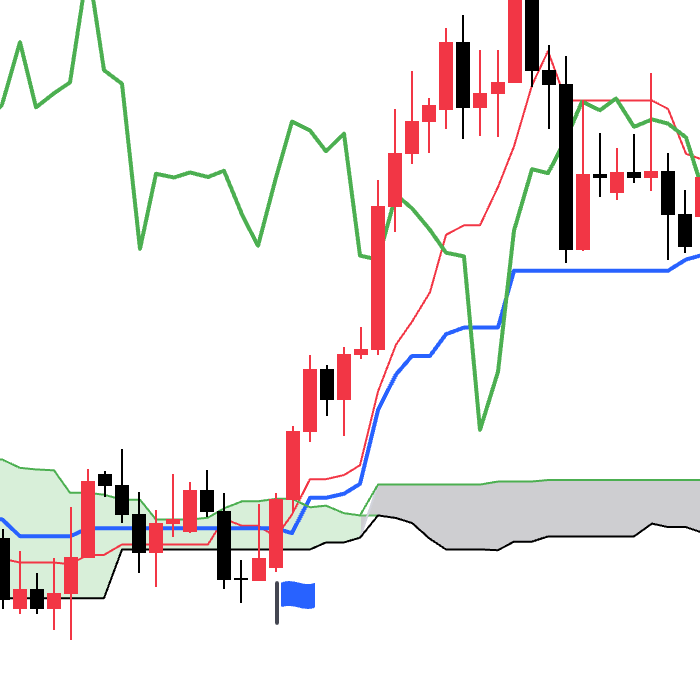 - 当价格线位于云层内部,并且延迟线上穿价格线的时候为中性看涨信号