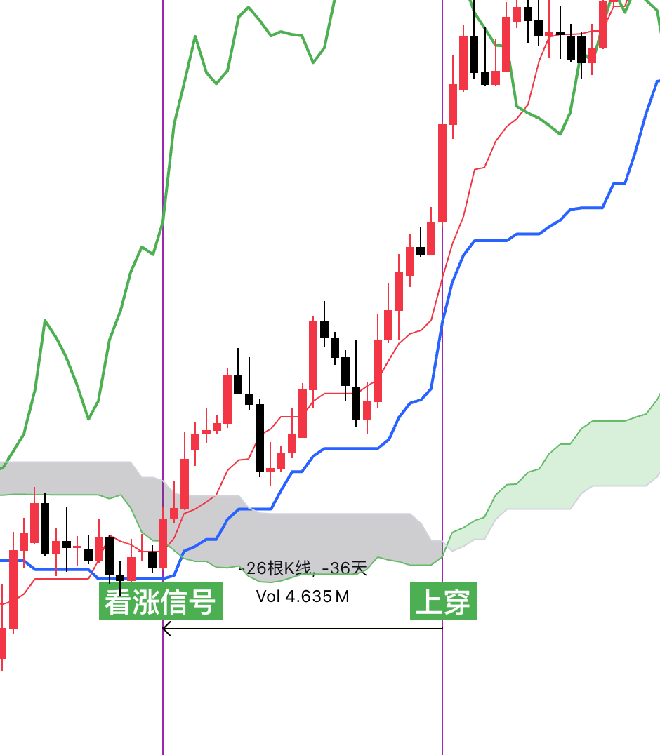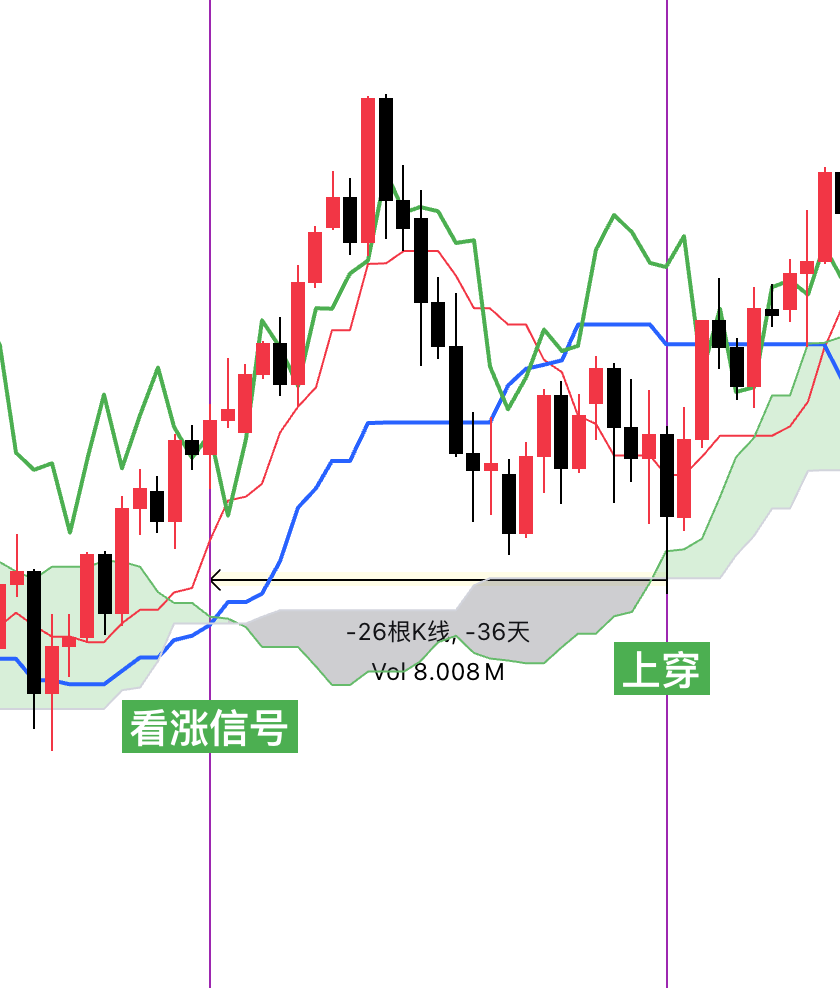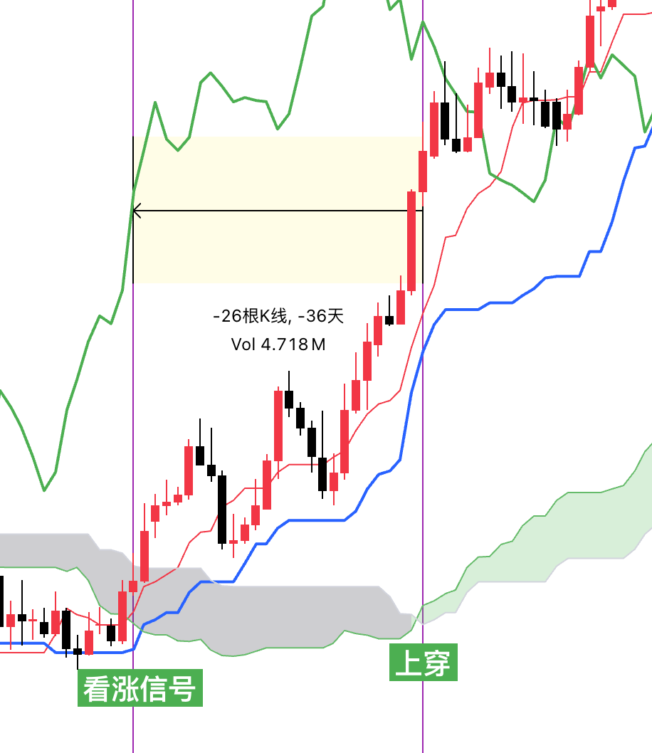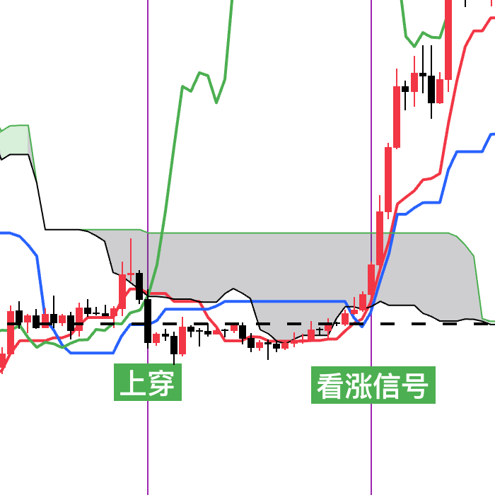 1.当价格线位于云层下方,并且延迟线上穿价格线的时候为初步看涨信号