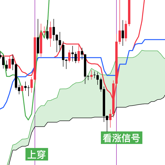 - 当价格线位于云层上方,并且延迟线上穿价格线的时候为强烈看涨信号