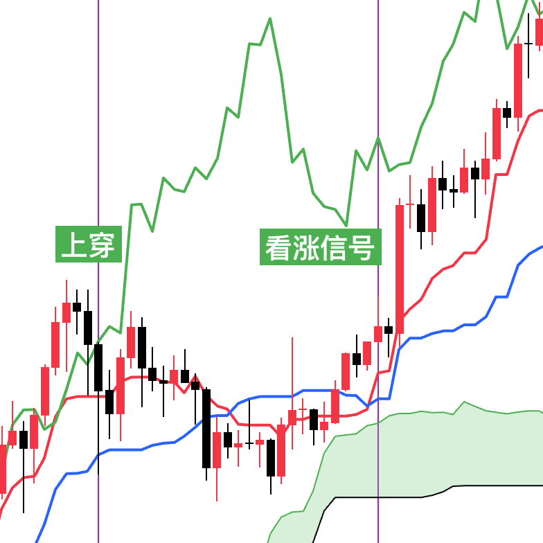 当价格线从基准线的下方上穿到上方的时候就会出现看涨信号