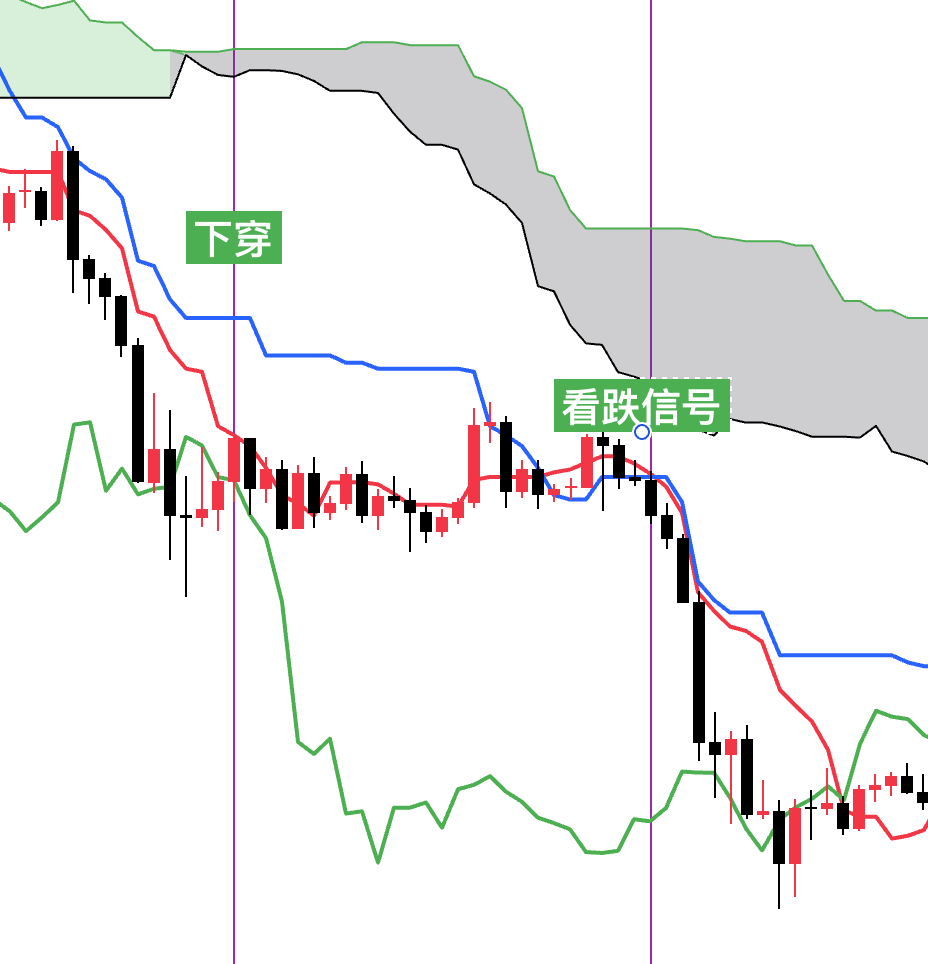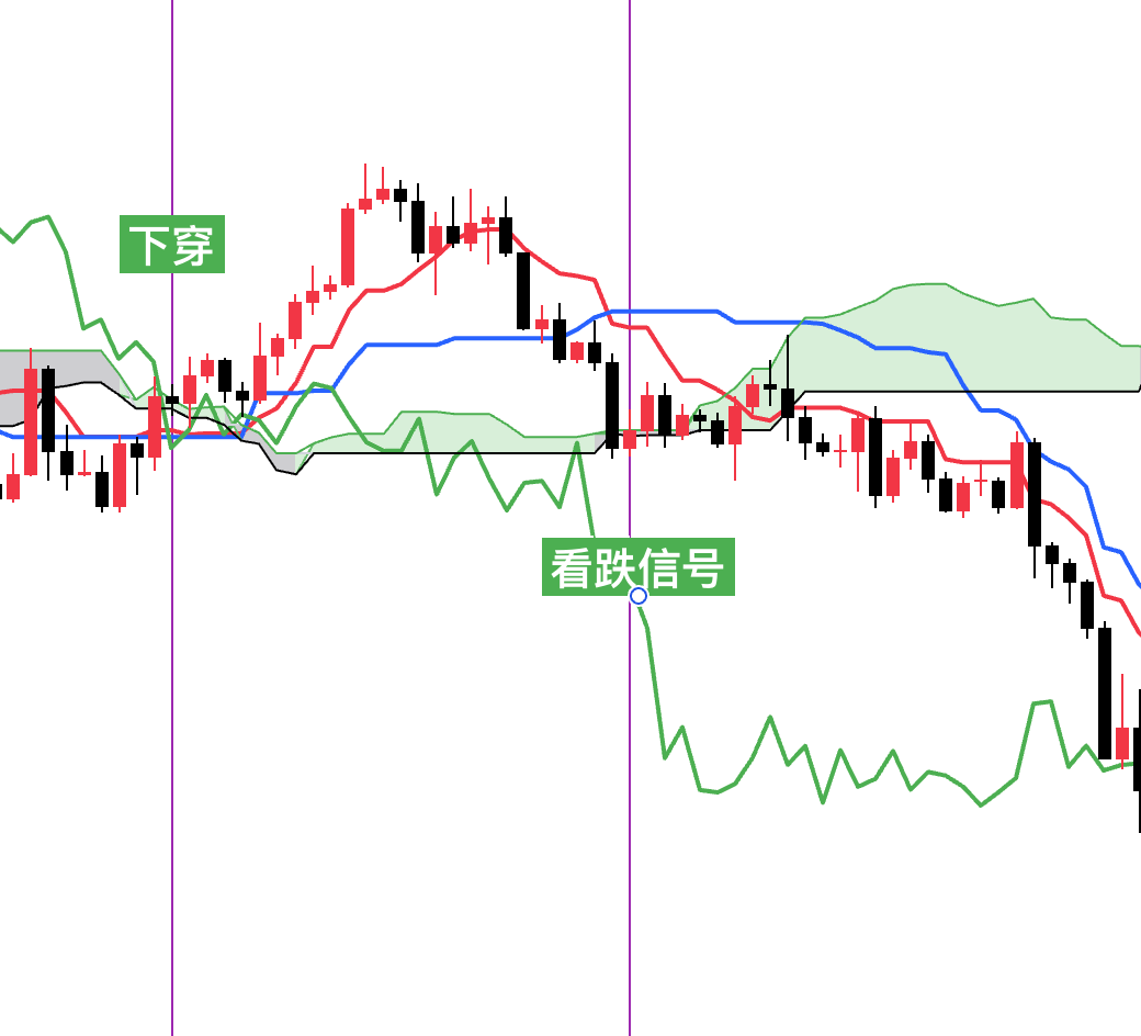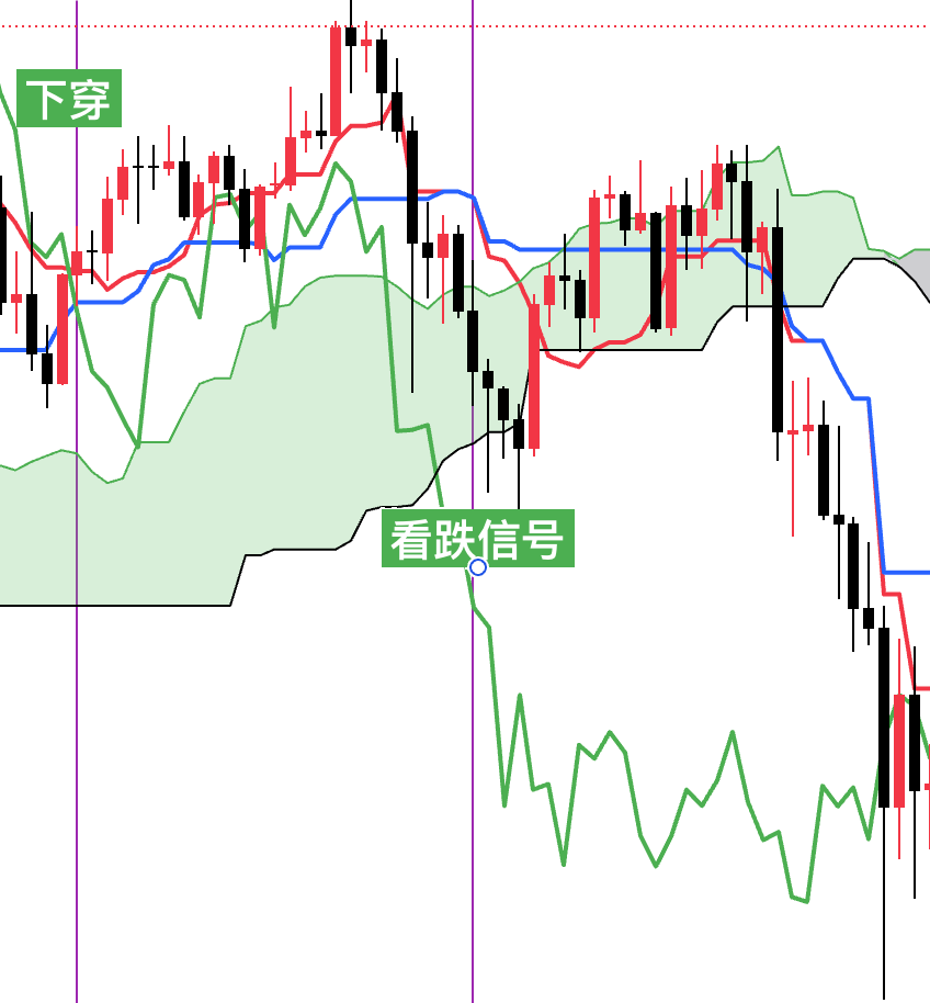 3.当价格线位于云层下方,并且延迟线下穿价格线的时候为强烈看跌信号