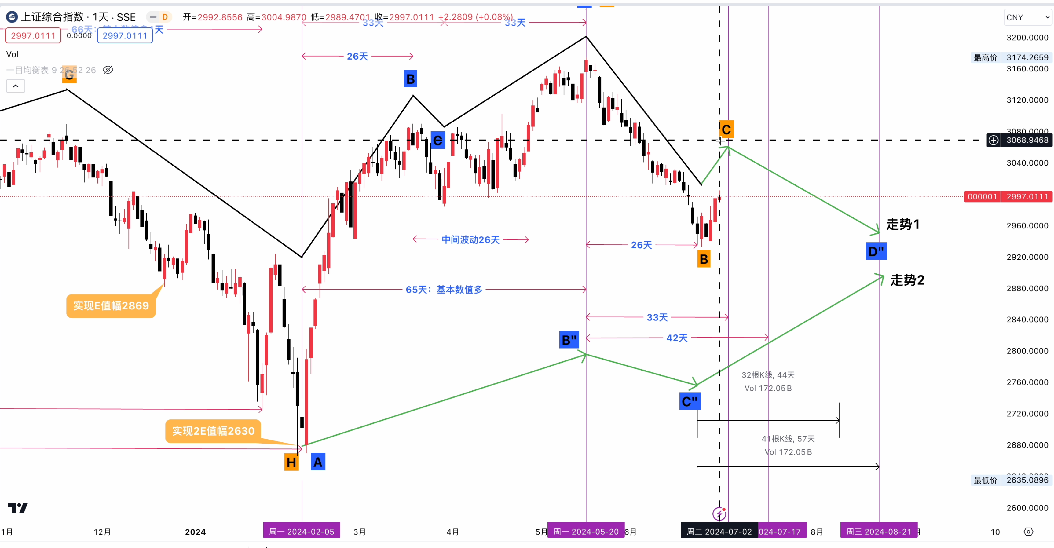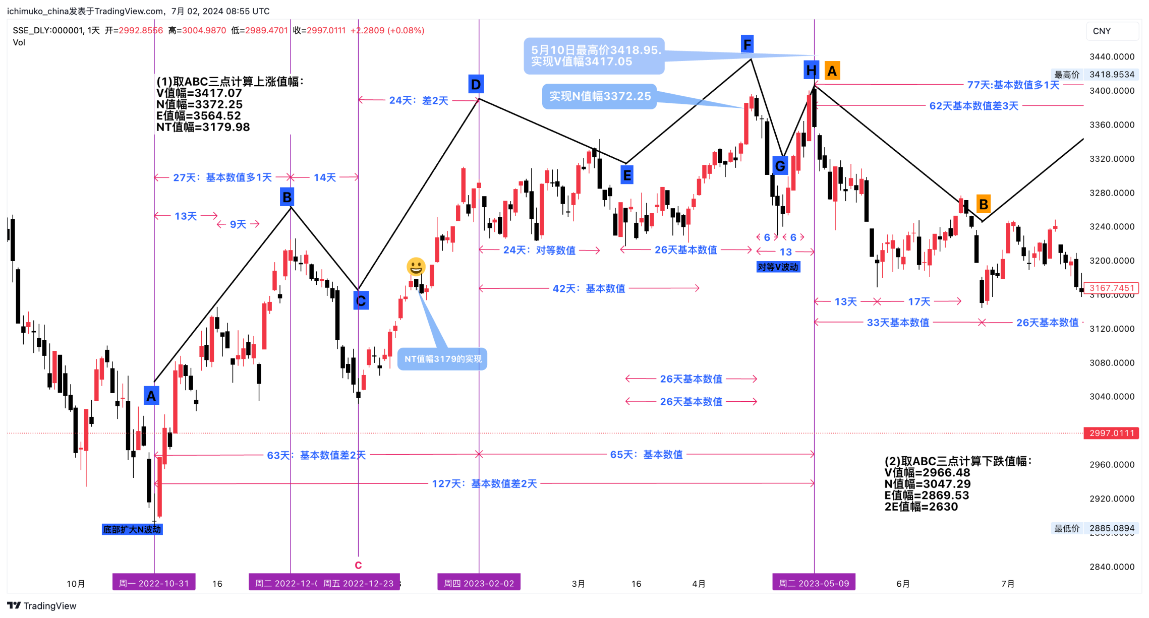 之前做这个分析的是在7月2日。上证指数收2997点,未能有效突破3000点。我们根据三论得出2种走势。后期有时间和大家详细解读。